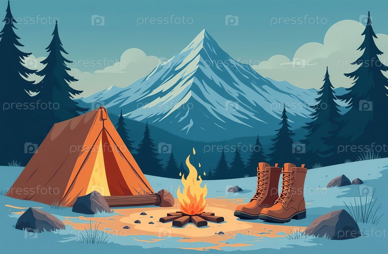 Походные ботинки сушатся у костра, палаточный лагерь в горах. Генеративный искусственный интеллект