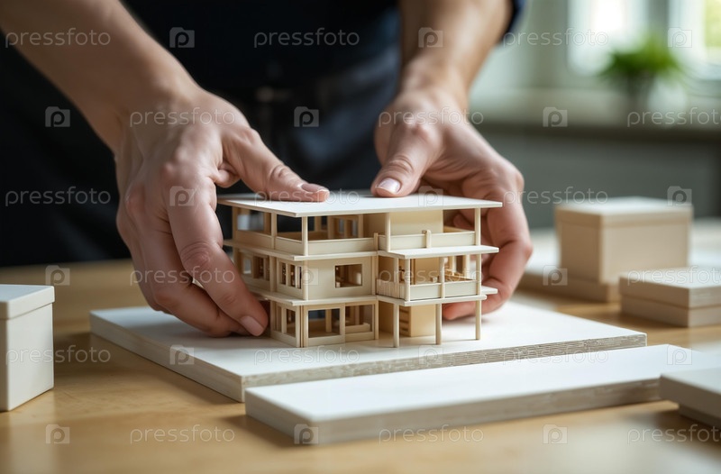 Архитектор монтирует модель коттеджа дом стол офис, крупный план руки. Генеративный искусственный интеллект