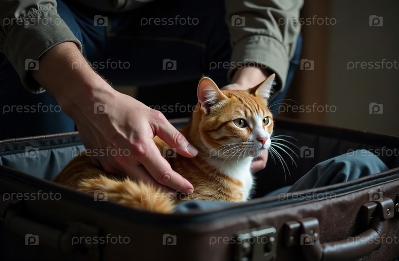Мужчина пакует чемодан для поездки, милый домашний кот лежит в багаже. Генеративный искусственный интеллект