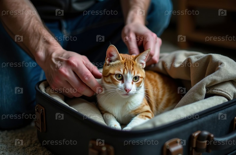 Мужчина пакует чемодан для поездки, милый домашний кот лежит в багаже. Генеративный искусственный интеллект