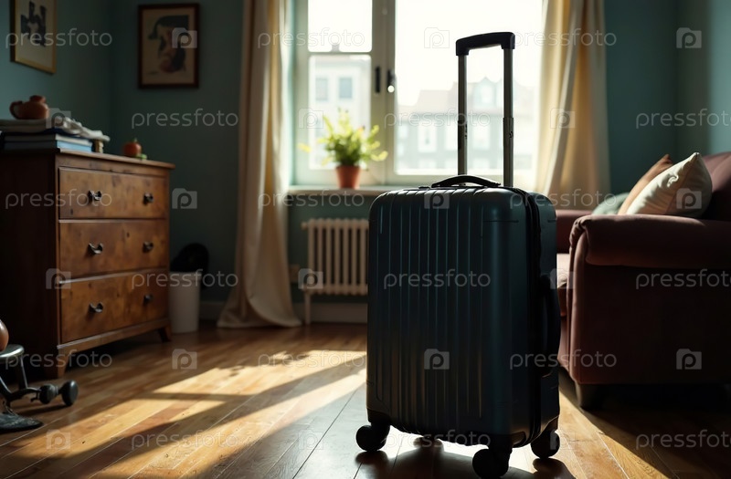 Чемодан, упакованный для поездки, стоит в квартире, интерьер спальни. Генеративный искусственный интеллект