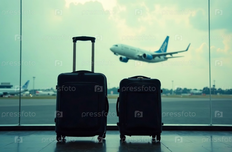 Два чемодана стоят в аэропорту, самолет взлетает, ждут отправления. Генеративный искусственный интеллект