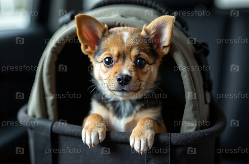Переноска для собак на заднем сиденье автомобиля, путешествие на машине с питомцем. Генеративный искусственный интеллект