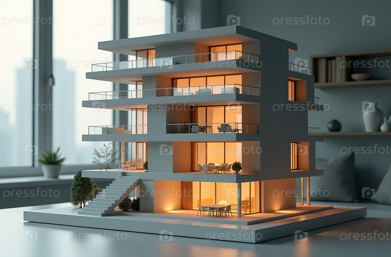 Модель многоэтажного здания, дом, стоя на столе архитектора в офисе. Генеративный искусственный интеллект