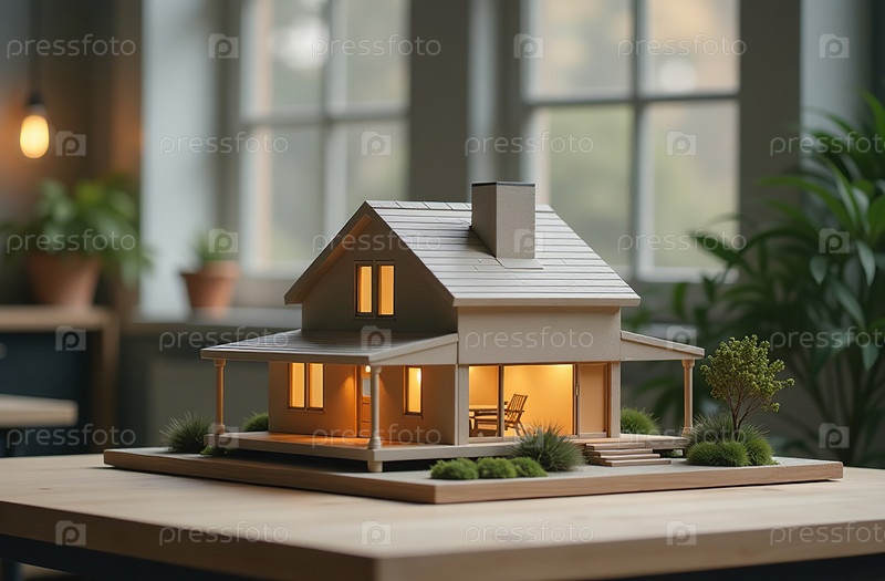 Модель коттеджа, здание дома, стенд на столе архитектора в офисе. Генеративный искусственный интеллект