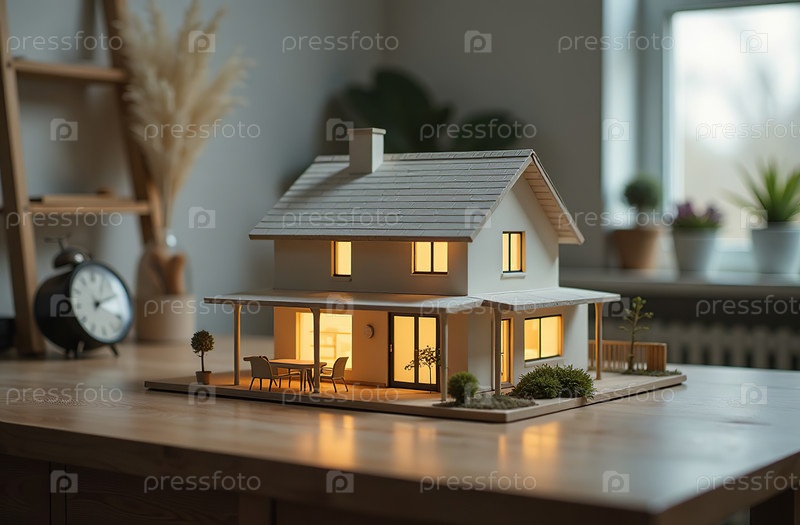 Модель коттеджа, здание дома, стенд на столе архитектора в офисе. Генеративный искусственный интеллект