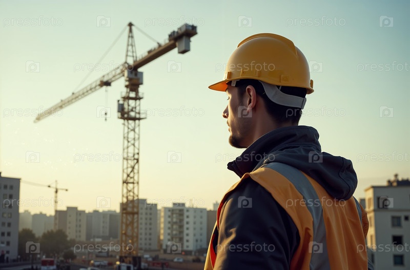 Инженер на строительной площадке, строительный кран строит здание. Генеративный искусственный интеллект