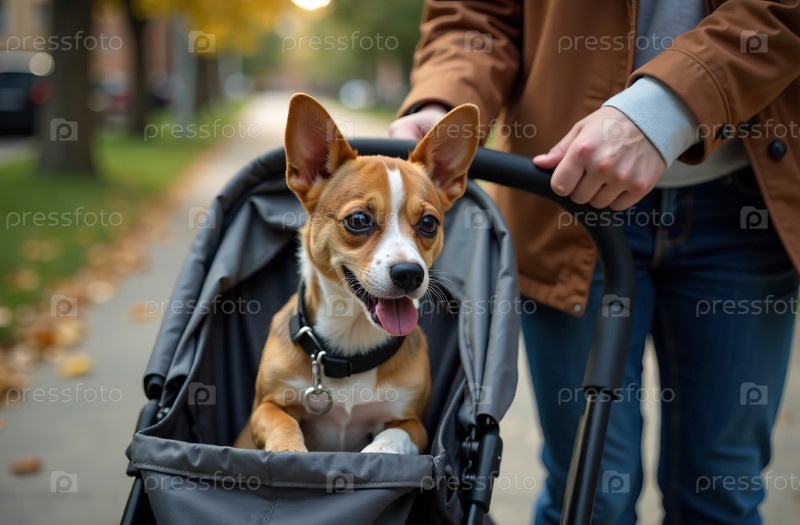 Женщина везет питомца в коляске, собака гуляет снаружи, сидя в саду. Генеративный искусственный интеллект