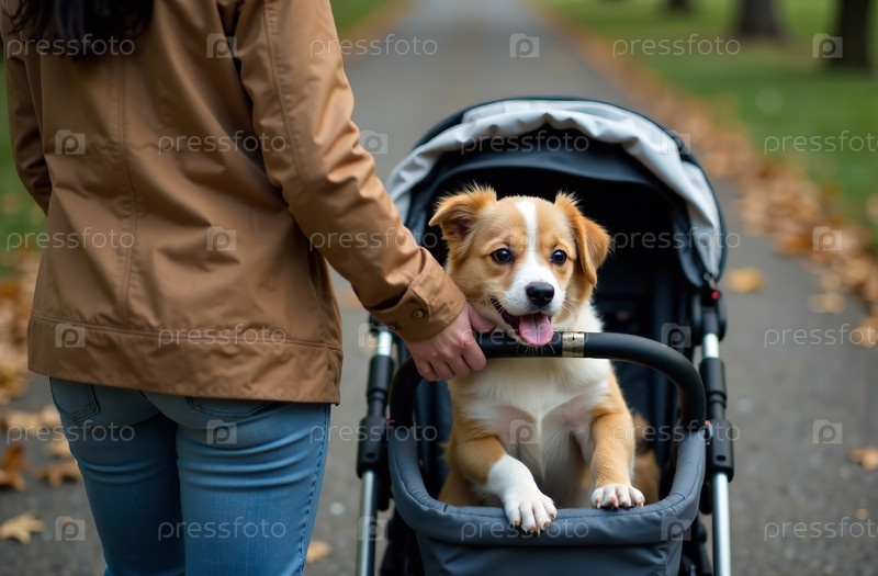 Женщина везет питомца в коляске, собака гуляет снаружи, сидя в саду. Генеративный искусственный интеллект