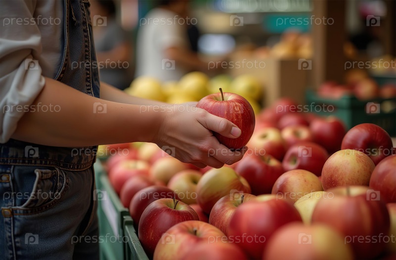 Женщина покупает яблоки на рынке, крупный план рук, витрина с фруктами. Генеративный искусственный интеллект