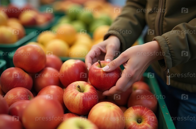 Женщина покупает яблоки на рынке, крупный план рук, витрина с фруктами. Генеративный искусственный интеллект