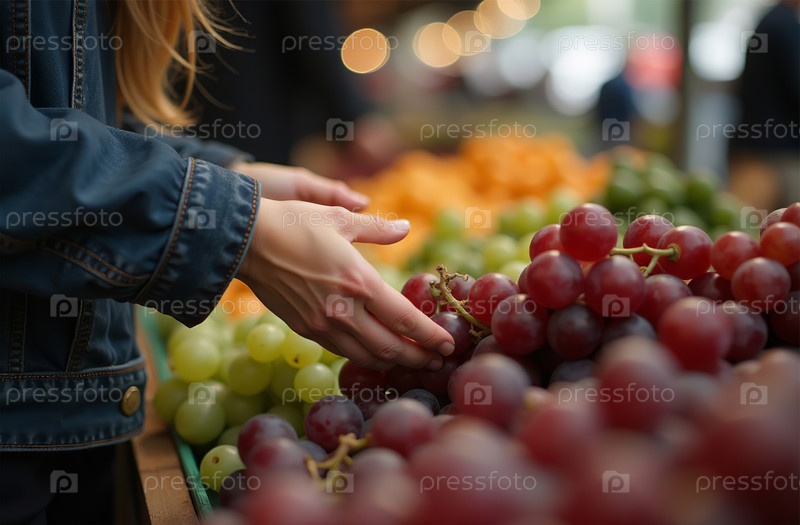 Женщина покупает виноград на рынке, руки крупным планом, фруктовый магазин. Генеративный искусственный интеллект