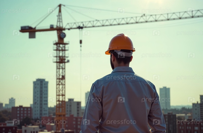 Инженер на строительной площадке, строительный кран строит здание. Генеративный искусственный интеллект