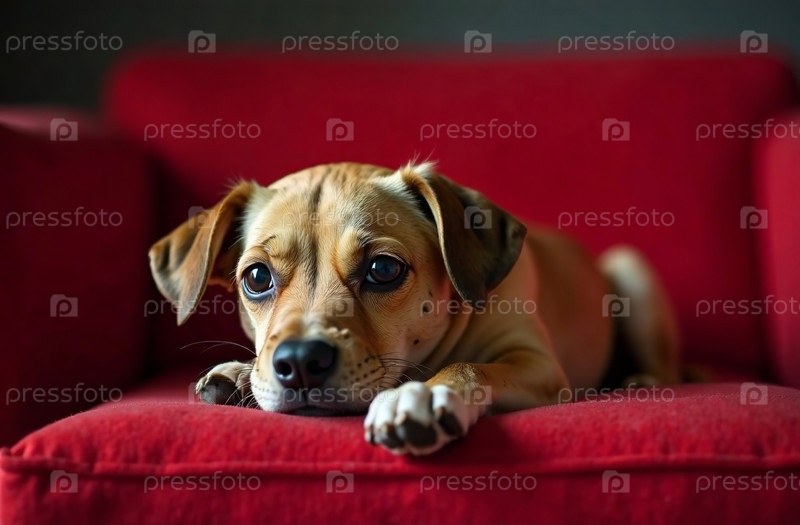 Собака лежит на красном диване дома, питомец отдыхает, интерьер внутри дома. Генеративный искусственный интеллект
