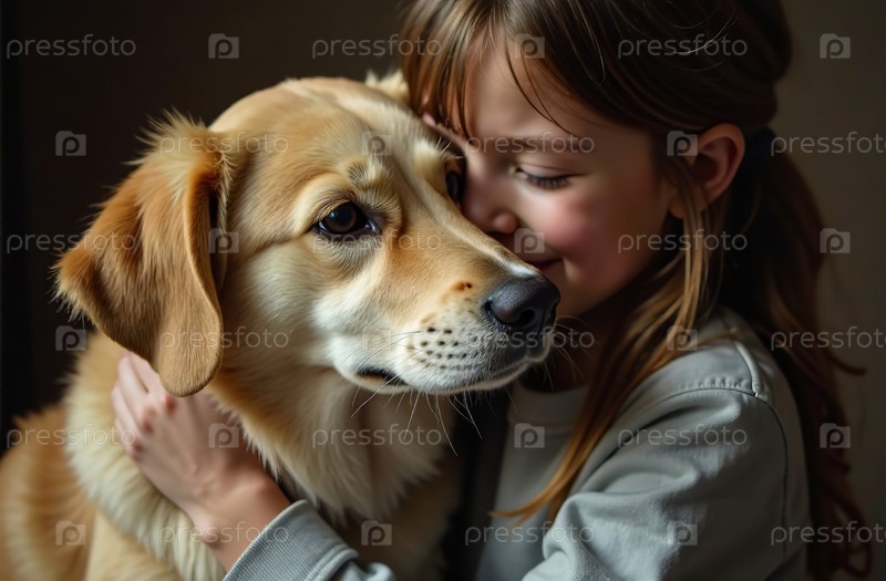 Ребенок обнимает питомца, дружба собаки и ребенка, темный фон. Генеративный искусственный интеллект