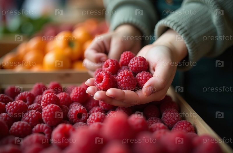 Женщина покупает малину на рынке, руки крупным планом, ягодный торговый центр. Генеративный искусственный интеллект