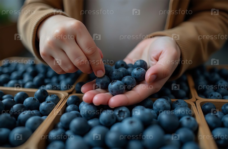 Женщина покупает чернику на рынке, руки крупным планом, ягодный торговый центр. Генеративный искусственный интеллект