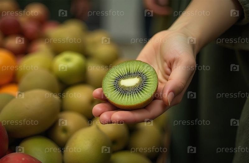 Женщина покупает киви на рынке, руки крупным планом, витрина с фруктами. Генеративный искусственный интеллект