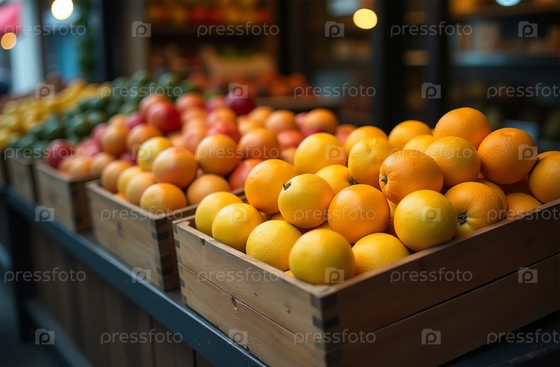 Фруктовый прилавок на рынке, фрукты в деревянных ящиках в магазине, торговый центр. Генеративный искусственный интеллект
