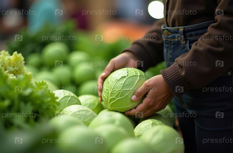 Женщина покупает капусту на рынке, руки крупным планом, овощной магазин. Генеративный искусственный интеллект