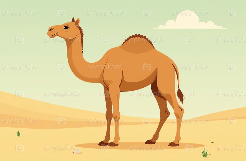 Одногорбый верблюд стоит на песке пустыни. Засушливая местность. Генеративный искусственный интеллект