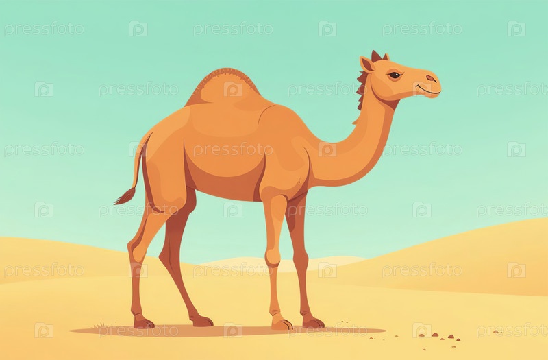 Одногорбый верблюд стоит на песке пустыни. Засушливая местность. Генеративный искусственный интеллект