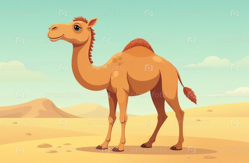 Одногорбый верблюд стоит на песке пустыни. Засушливая местность. Генеративный искусственный интеллект