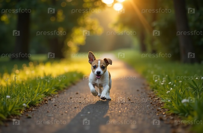 Прогулка с собакой в парке, бег питомца по тропинке, милая мордашка животного. Генеративный искусственный интеллект