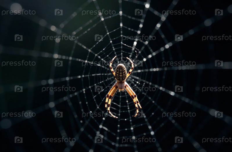 Хищный паук сидит в паутине и ждет жертву черный фон. Генеративный ИИ