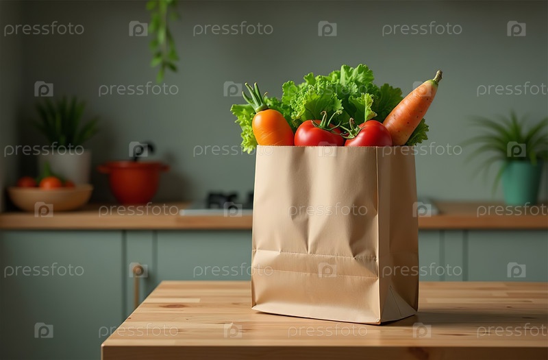 Стол для покупки бумажных пакетов, крупный план свежих овощей, яркая кухня. Генеративный искусственный интеллект