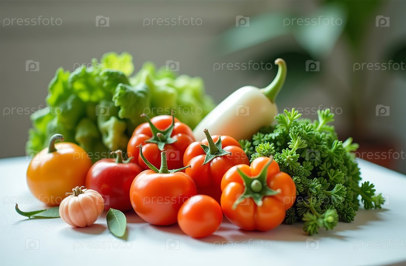 Натюрморт на столе, крупный план свежих овощей, яркая кухня. Генеративный ИИ