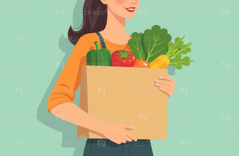 Девочка несет покупки в бумажном пакете, овощи и фрукты с рынка. Генеративный искусственный интеллект