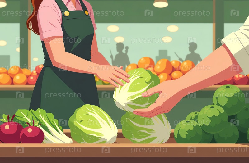 Женщина покупает капусту на рынке, руки крупным планом, овощной магазин. Генеративный искусственный интеллект