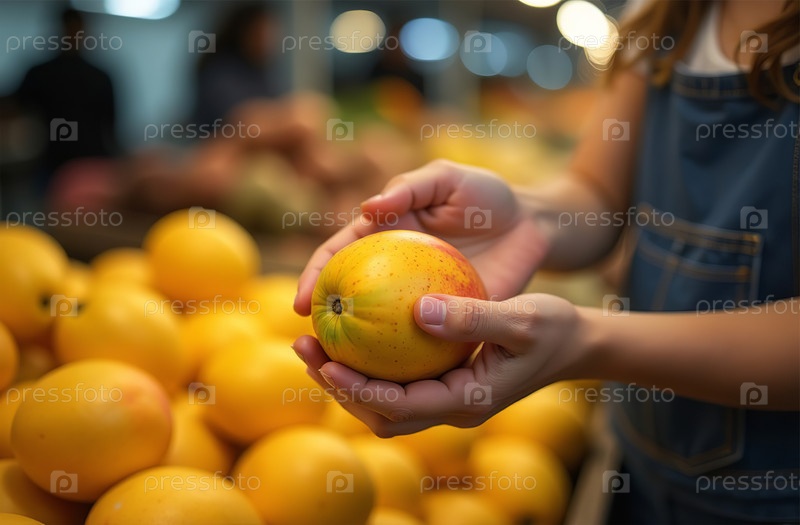 Женщина покупает манго на рынке, руки крупным планом, фруктовый магазин. Генеративный искусственный интеллект