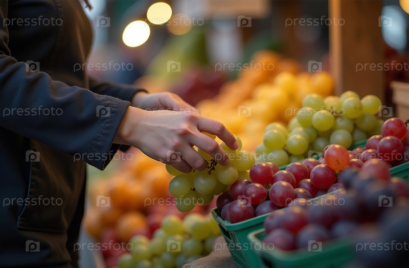 Женщина покупает виноград на рынке, руки крупным планом, фруктовый магазин. Генеративный искусственный интеллект