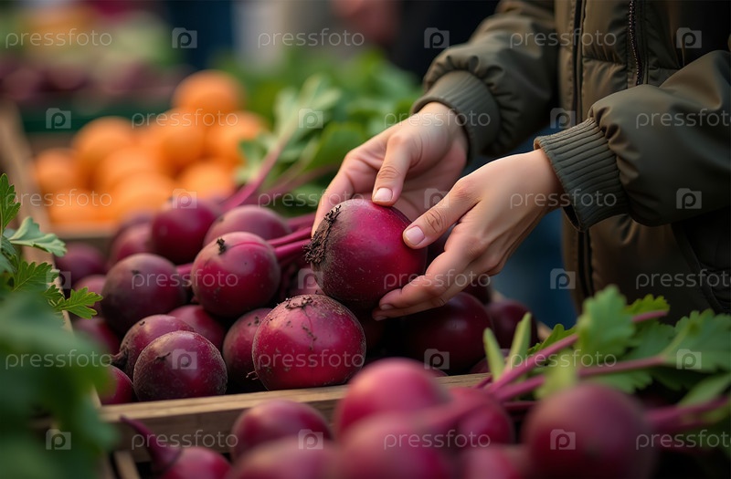 Женщина покупает свеклу на рынке, руки крупным планом, овощной торговый центр. Генеративный искусственный интеллект
