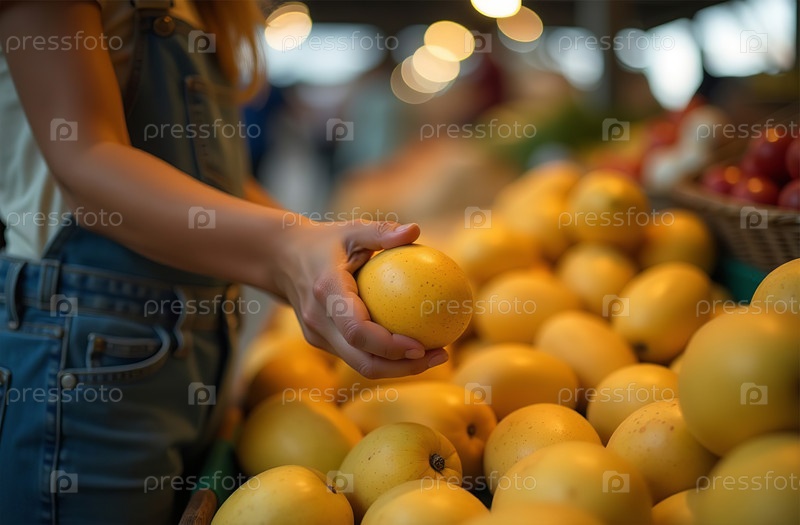Женщина покупает манго на рынке, руки крупным планом, фруктовый магазин. Генеративный искусственный интеллект