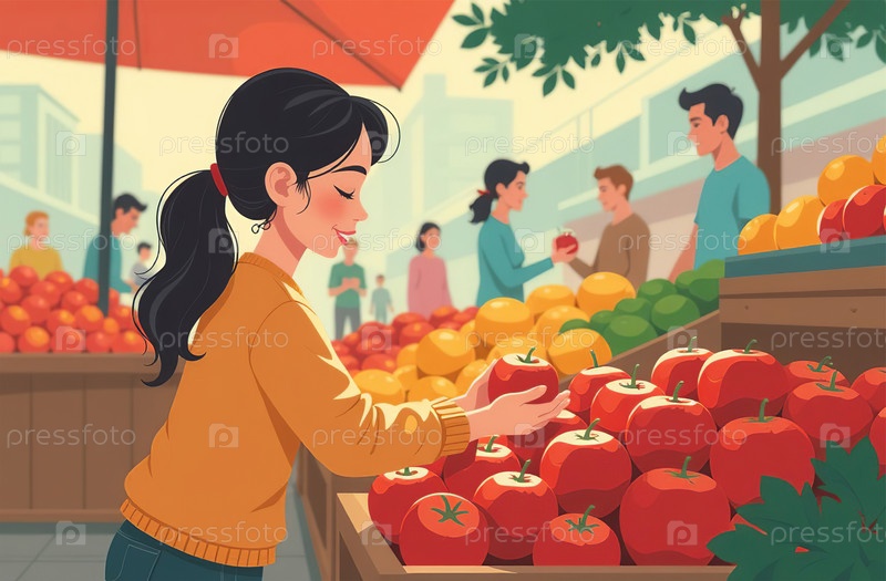 Женщина покупает помидоры на рынке, руки крупным планом, овощной магазин. Генеративный искусственный интеллект
