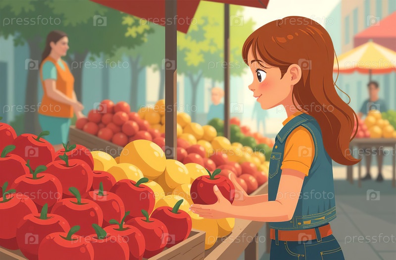 Женщина покупает яблоки на рынке, крупный план рук, витрина с фруктами. Генеративный искусственный интеллект
