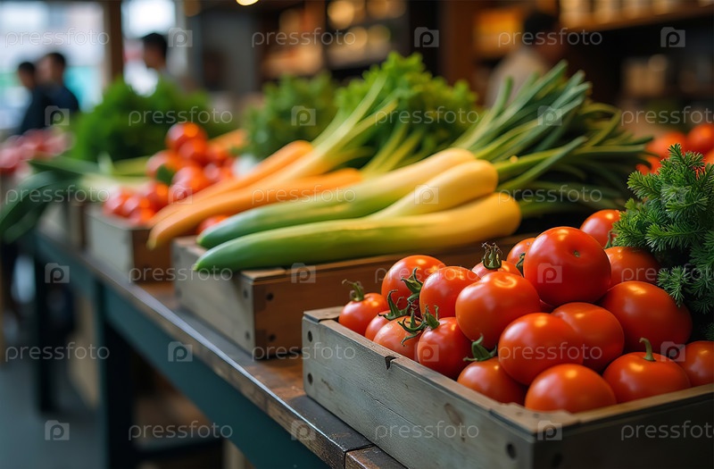Прилавок на овощном рынке, зелень в деревянных ящиках в магазине, торговый центр. Генеративный искусственный интеллект