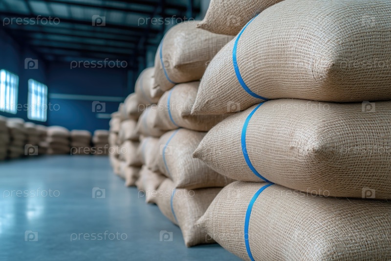 Мешки с мешковиной сложены на складе. Промышленный фон