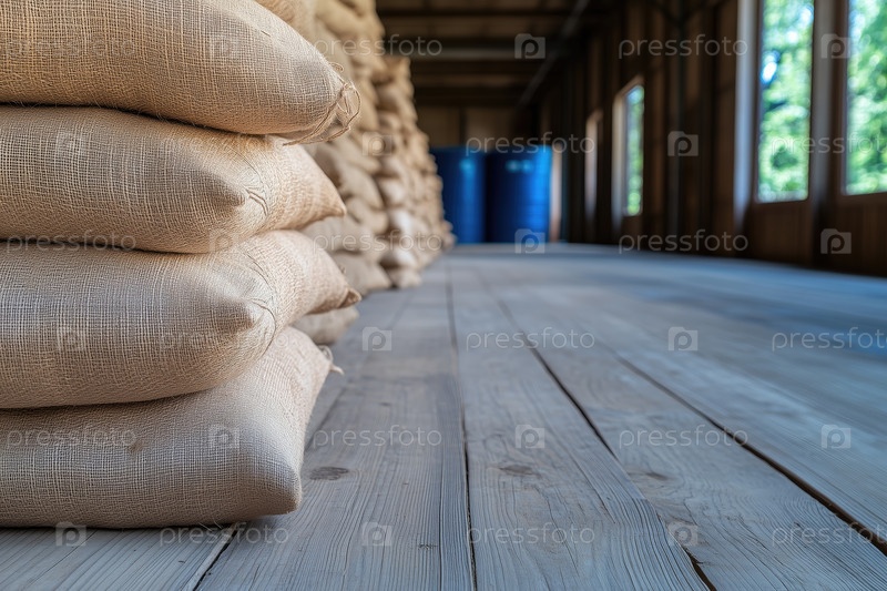 Стопки мешков из джута на деревянном полу на складе