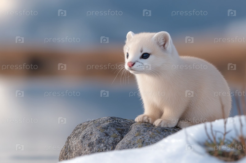 Крупным планом — ласка, сидящая на камне зимой