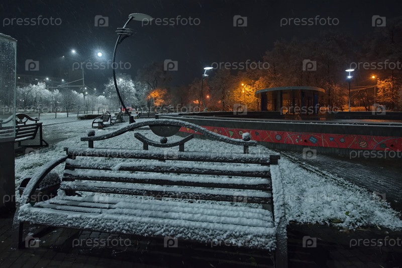 Новокузнецк, Россия. 01 ноября 2024 года. Живописный вид на деревья городского парка, покрытые первым осенним снегом и подсвеченные фонарями теплого и холодного света