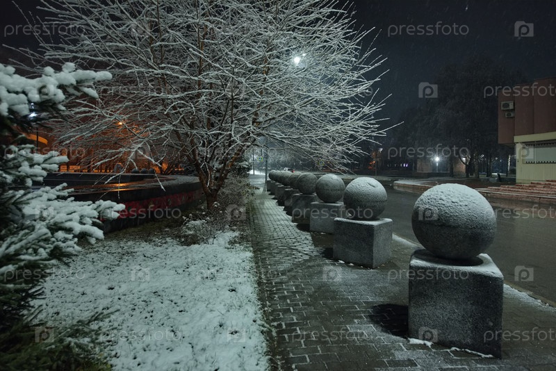 Новокузнецк, Россия. 01 ноября 2024 года. Живописный вид на деревья городского парка, покрытые первым осенним снегом и подсвеченные фонарями теплого и холодного света