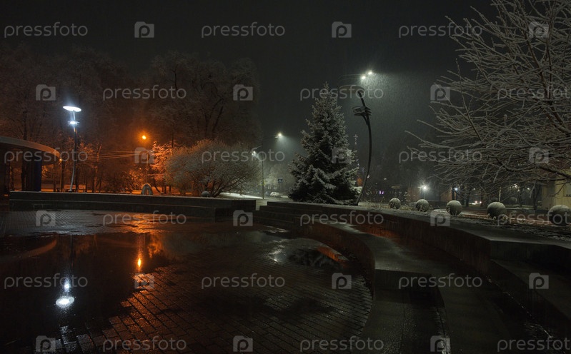 Новокузнецк, Россия. 01 ноября 2024 года. Живописный вид на деревья городского парка, покрытые первым осенним снегом и подсвеченные фонарями теплого и холодного света