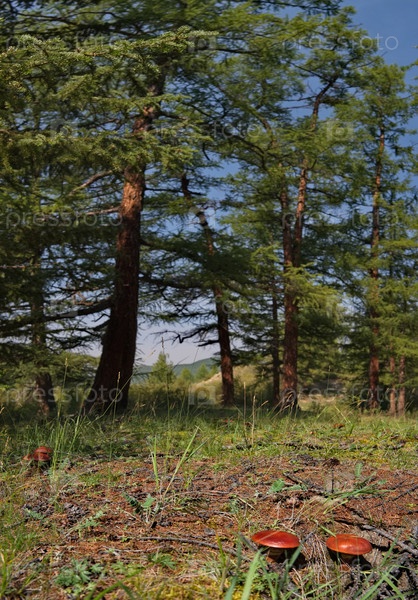 Россия, Восточная Сибирь, Бурятия. Маслята в Саянской тайге на солнечных сосновых опушках в разгар лета