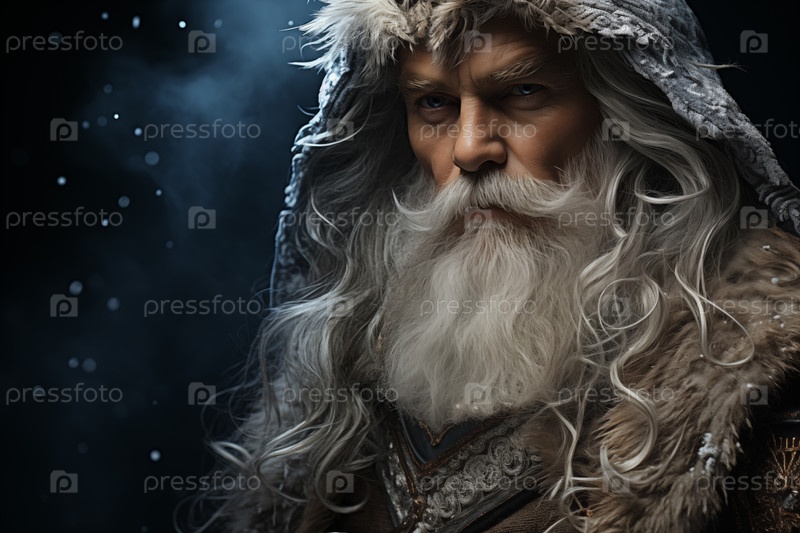 Портрет пожилого мужчины с длинной седой бородой в меховой старинной одежде на зимнем фоне