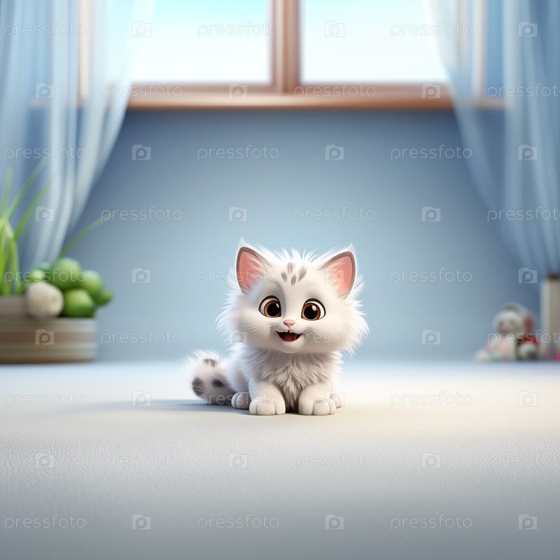 Белый котенок сидит на полу в помещении