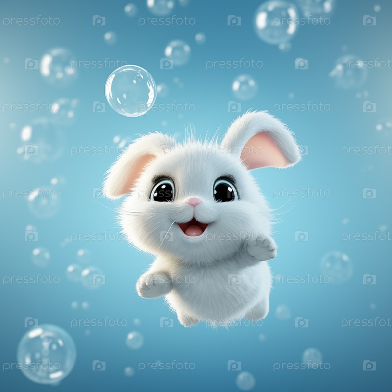 Милый белый кролик среди мыльных пузырей на синем фоне